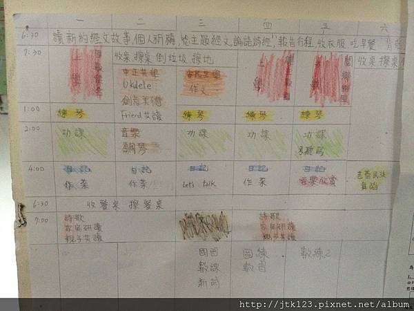 這是妹妹T二年級上學期的時間表。星期一、四、五到學校上半天課。下午回家後練琴、寫功課,沒上學的時間,活動與作息跟自學的姊姊一樣。