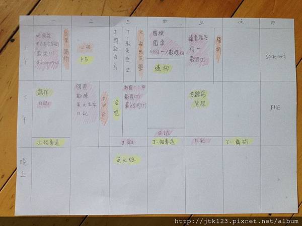 這張時間表就只有寫這學期的學習活動,用顏色來分類—粉紅色代表小孩可以自己進行的作業時間(我會在另一篇文章中說明小孩每天要做的不同作業),橘色代表我必須帶弟弟去的課程與活動,黃色代表小孩可以自己去上的課,綠色代表還需要我指導監督的學習活動。
